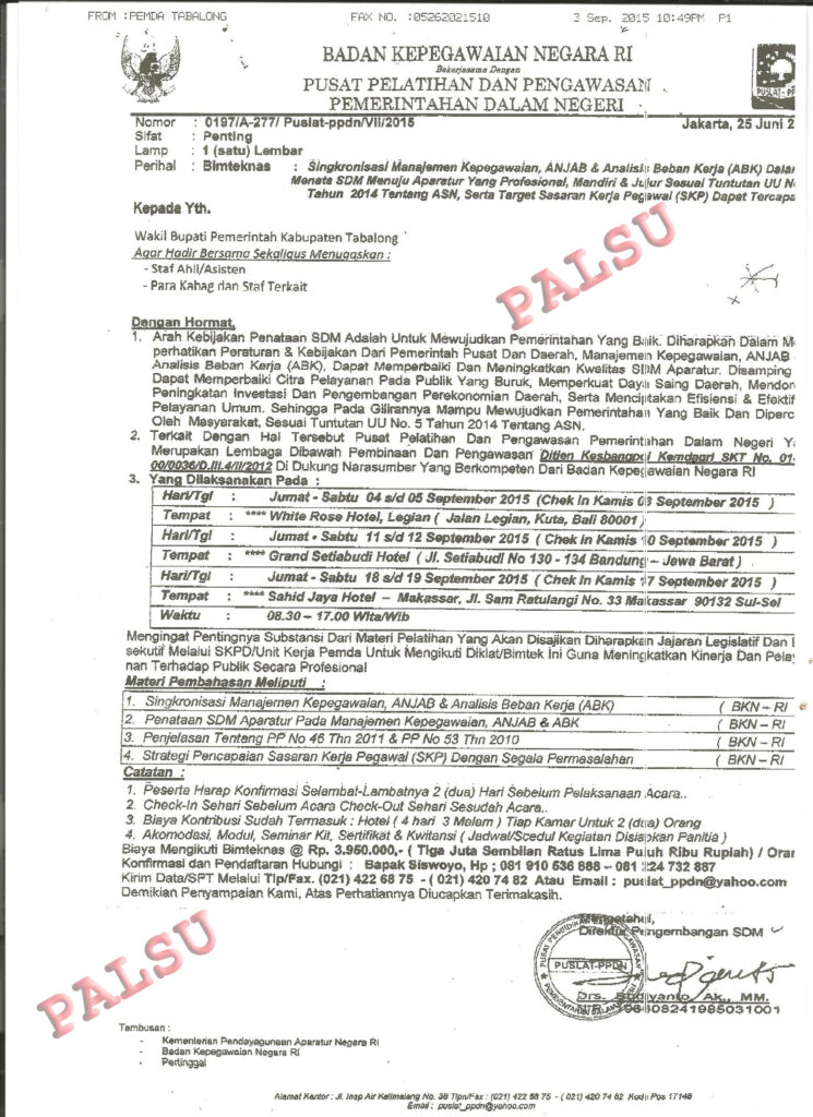 Di Publikasikan Oleh Humas BKN, di Web resmi BKN Maraknya kasus penipuan dengan mencatut nama BKN bukan hal baru. Tidak hanya penipuan pada ranah penerimaan CPNS. Kali ini BKN disambangi dengan adanya surat palsu kegiatan Diklat/Bimtek Sinkronisasi Manajemen Kepegawaian dengan mencantumkan kerjasama BKN dan Pusat Pelatihan dan Pengawasan Pemerintahan Dalam Negeri.